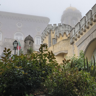 An interesting fact about Sintra is that it has a microclimate. Almost every day, there is a long cloud that sits on top of the mountains. It is referred to as Sintra's hat or helmet. We arrived around 10 a.m. and the palace was still in the cloud. From the parking area, when you looked up you would never even know the palace was there. It gave a very mystical vibe.