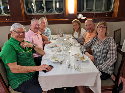 We met a great couple from Oregon on the cruise and the six of us hung out together and laughed ourselves silly when we weren't solving the world's problems. We got a picture of us at our last dinner. I got a picture from our cabin of the last lock we went through. It shows you just how close those walls are.